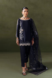 Chic and sophisticated, this elegant black ensemble is purely hand crafted with artistry and finesse. The shirt features intricate silvery embellishment with scalloped detailing at the hem, elevated by a delicate side motif. Sparkling crystals add a touch of radiance, while scalloped detailing along the sleeves and cuffs lends refined sophistication. Paired with straight pants and a sheer organza dupatta, this look is the perfect blend of modern elegance and festive charm.