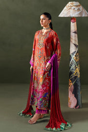 A majestic deep rust set featuring a long shirt with a graceful flared cut, richly adorned with sequins and bead work in floral, paisley, and peacock motifs. The neckline and front of the shirt are heavily embellished, while the sleeves are beautifully worked with accents of fuchsia and gold. Styled with a two-toned crushed dupatta and tailored trousers, detailed at the hem, this ensemble perfectly merges traditional artistry with modern sophistication.