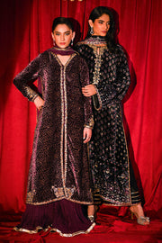 This elegant black discharge kurta set features a zardozi-embellished neckline and delicate handwork scattered throughout, enhanced with subtle gota details for a touch of shimmer. Paired with a medium silk izaar finished with gota edging and a matching discharge print dupatta, this ensemble strikes the perfect balance between timeless tradition and refined sophistication.