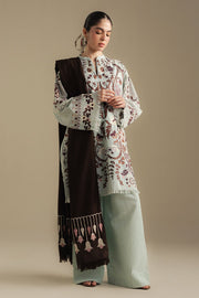 An aqua blue khaddar shirt and trouser paired with a brown shawl, a refreshing yet earthy balance made for the winter season.
