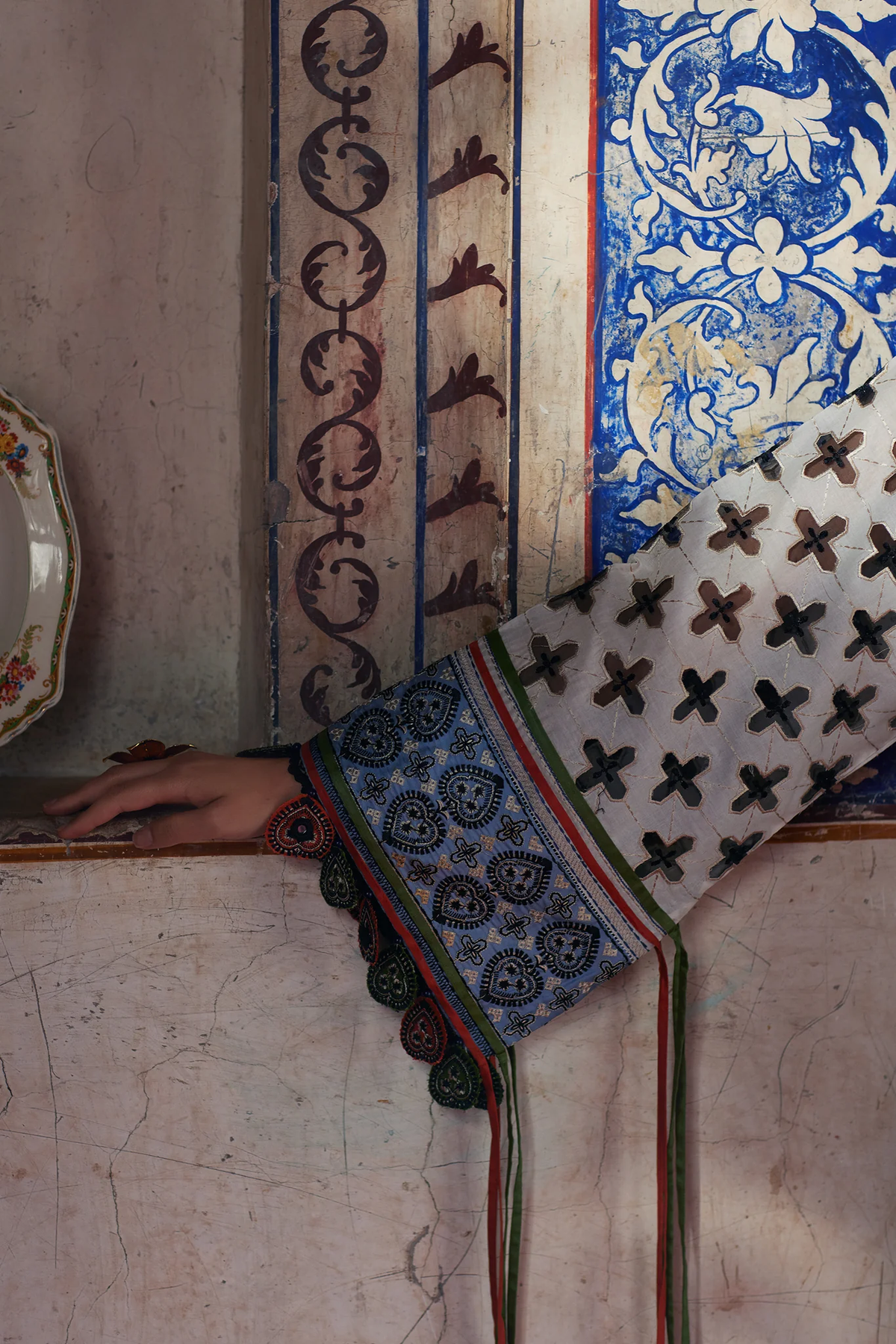 The look is completed with tonal trousers and a gossamer cotton net dupatta, adorned with embroidered florals and ornate borders that ripple like waves.
