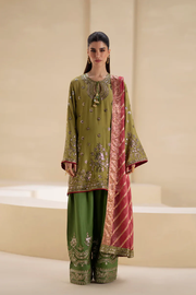 Dazzle with opulence in this magnificent moss green embroidered suit. The straight-cut shirt is crafted from a subtle green fabric and is extravagantly adorned with heavy silver and gold sequin work, scattered across the entire bodice and sleeves. The neckline features elaborate beading and tassel details, while the wide, full-length sleeves are finished with a rich border. The ensemble is elevated by contrasting dark green shalwar. The shalwar boast a heavy, ornate border of gold and sequin embroidery at the hem, creating a regal and balanced silhouette. A deep pink, richly woven dupatta with gold borders completes this luxurious look, making it a perfect statement piece for formal or wedding festivities.