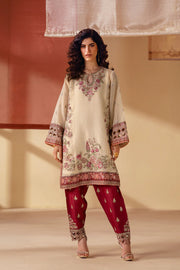 Explore the richness of modern artistry. This stunning suit features a light beige shirt adorned with intricate floral embroidery in vibrant shades of red and green. The look is completed with a beautiful maroon shalwar that is also heavily embroidered with a detailed, matching pattern at the hem. This ensemble is a celebration of striking color and captivating craftsmanship, perfect for making a bold and elegant statement.