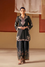 Explore the depths of elegant artistry. This stunning black 3-piece suit includes a shirt, slip, and shalwar. The shirt is beautifully adorned with intricate floral embroidery in vibrant shades of pink, green, and gold, while the shalwar features a matching embroidered border at the hem. This ensemble is a celebration of rich color and captivating craftsmanship, perfect for making a bold and elegant statement.