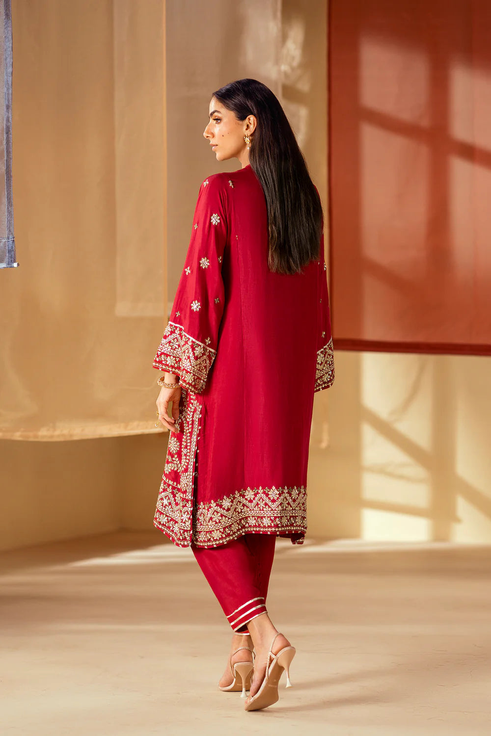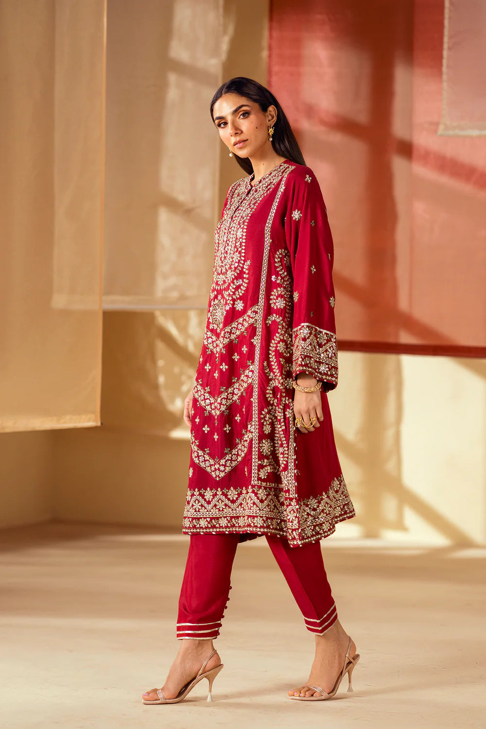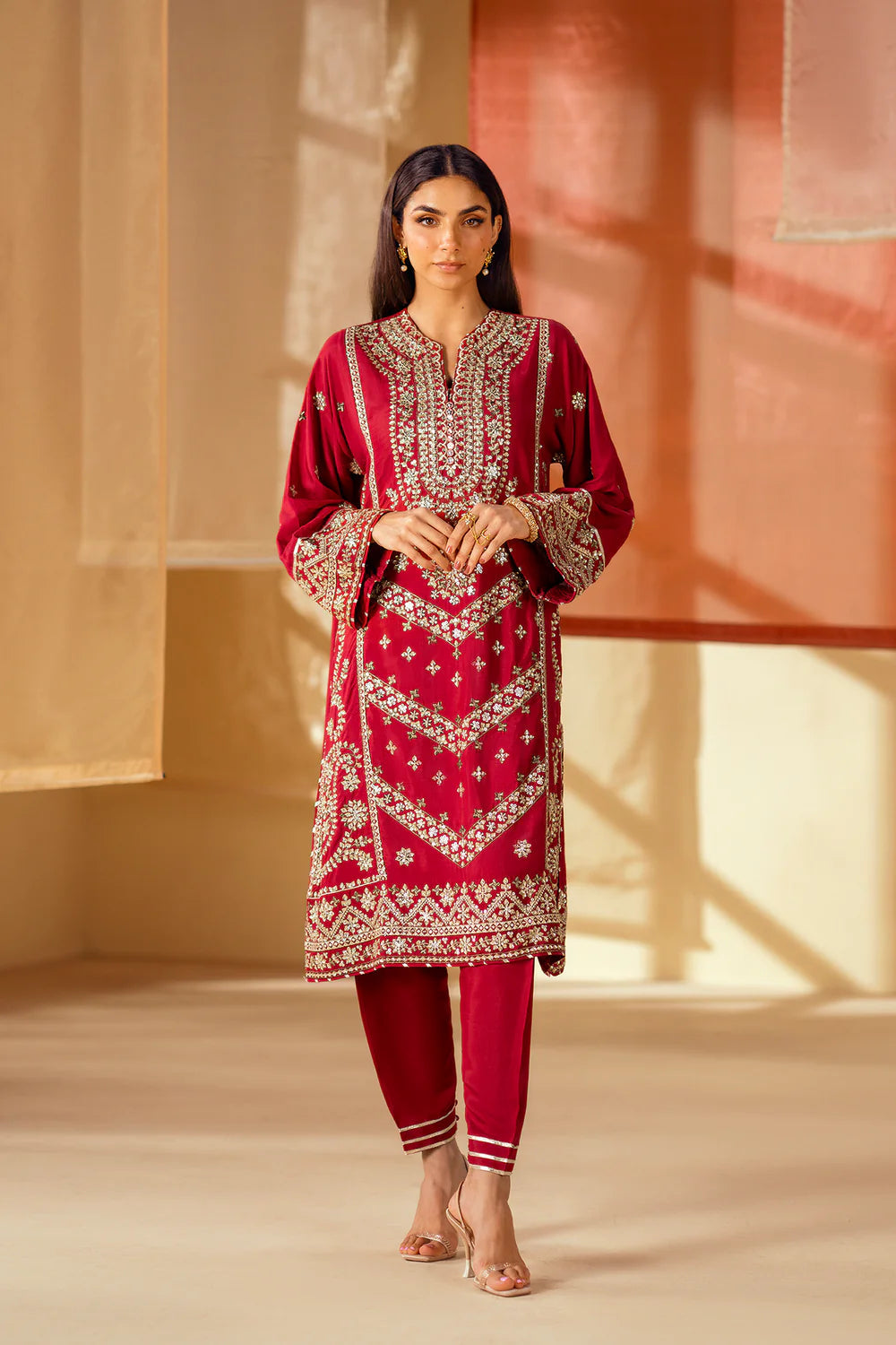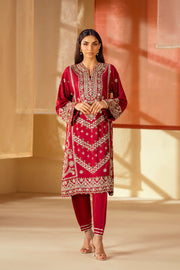 Drenched in a deep, captivating hue, this stunning embroidered suit is a vision of regal sophistication. The rich maroon fabric serves as a beautiful canvas for intricate silver and gold embroidery that adorns the front of the shirt and the borders of the sleeves. The tapered-fit shalwar feature a matching border with button addons, creating a cohesive and elegant look. This ensemble is a celebration of luxurious color and timeless artistry, perfect for making a grand statement.