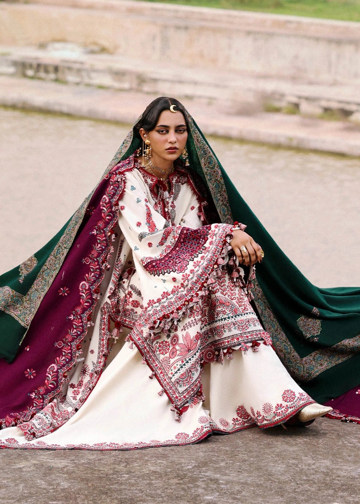 A vision of unblemished elegance, this unstitched ivory ensemble offers a refined take on the classic karandi silhouette. The shirt is beautifully elevated by intricate delicate embroidery and borring details. A striking contrast is achieved with the accompanying purple embroidered karandi shawl, which introduces a vibrant pop of color. The outfit is flawlessly completed with matching ivory trousers featuring tasteful embroidery accents, crafting a look designed to inspire effortless and captivating grace.