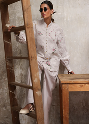Rue in Light Grey Linen Cotton Co-ord Set from the Image Fusion collection features a button-down embroidered shirt with a collar and full-length sleeves paired with matching pants.
