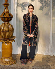Description: A mid-length blue shirt, embroidered in Kashmiri motifs and adorned with tassels. Bell sleeves and straight pants carry the design language forward, while the embroidered scarf ties it all together in effortless grace.