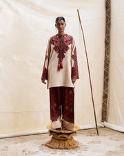 Description: A beige short shirt with Kashmiri embroidery in rust tones at the neckline, framed with playful tassels. Bell sleeves with embroidered patches extend the story, while a rust shalwar and scarf complete the look in warm, earthy elegance.