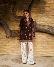 Description: A short brown shirt with multicolor embroidery, styled with bell sleeves and paired against ivory pants. A matching embroidered scarf brings balance — earthy richness set against serene contrast.