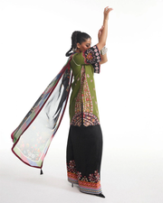 Description: The digitally printed silk scarf brings elegance through its refined jewel-toned stripes and delicate motifs. Soft and fluid, it drapes beautifully, while the tassel-edged finish lends a refined touch to the traditional look.