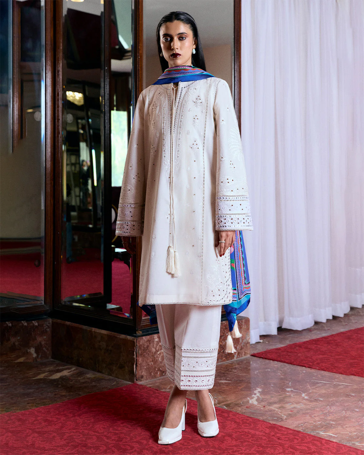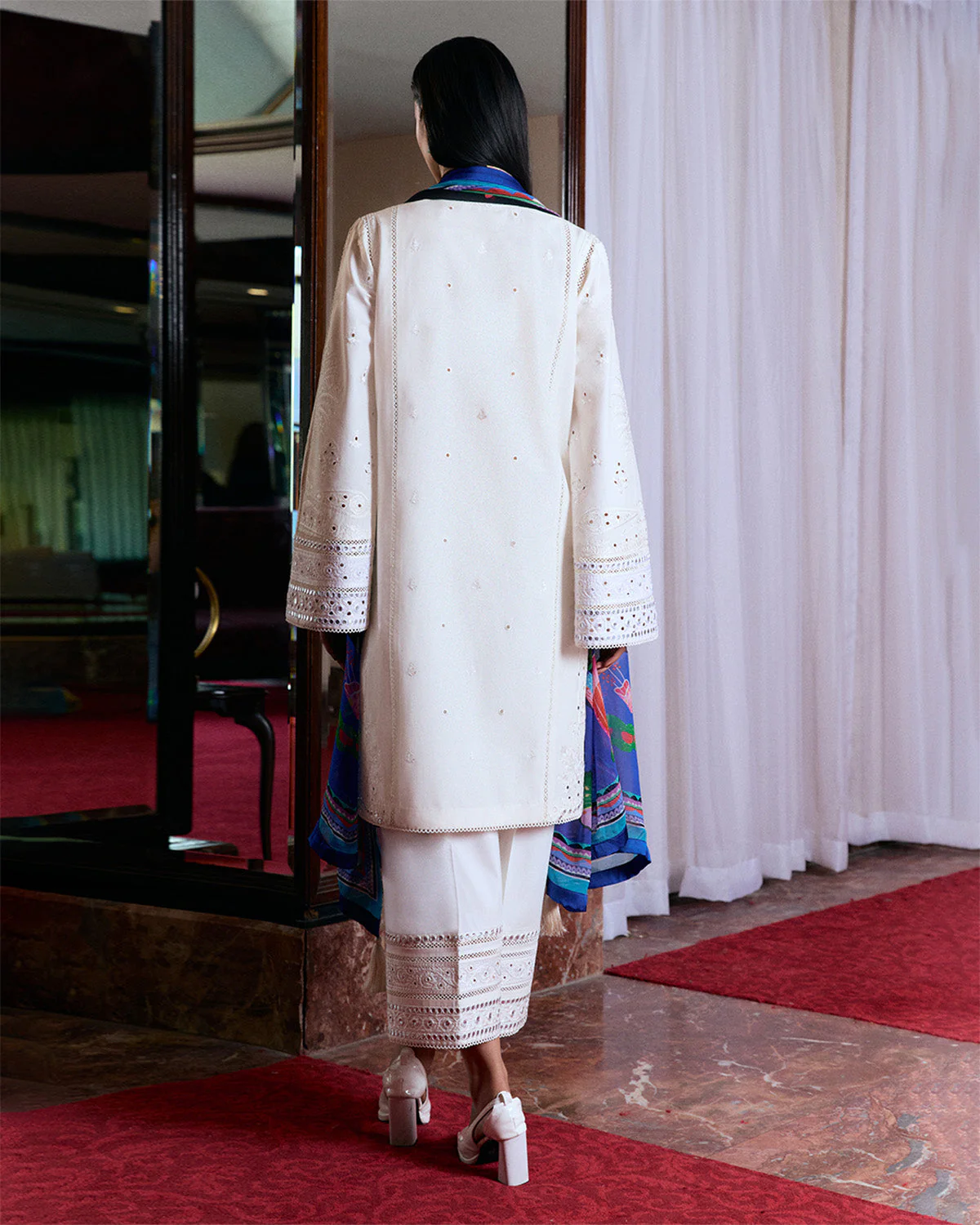 Description: This off-white ensemble captures the charm of traditional craftsmanship in a contemporary silhouette. The long shirt is adorned with monochrome embroidery, enhanced with delicate panni work and fine boring, while tassels add a soft, tactile detail at the front. Bell sleeves mirror the shirt’s embellishments with graceful volume and intricate finish. The look is completed with culottes that carry the same embroidery and embellishments, creating a harmonious, tonal statement. A digitally printed chiffon dupatta introduces lightness and flow, tying the ensemble together with effortless grace.