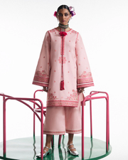 Description: "This elegant light pink ensemble is a tribute to tradition, beautifully detailed with multicolored embroidery across the shirt, bell sleeves, and culottes. The shirt features delicate tassels at the neckline, while the embroidered sleeves add a soft, flowing silhouette. Paired with wide-legged culottes that echo the same intricate patterns, the look is completed with a bold red scarf — richly embroidered and finished with tassels — adding a refined contrast to this graceful outfit.