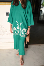 A minimalist yet striking outfit where a garden of contemporary white floral and botanical embroidery blooms from the hem, giving it a fresh and sophisticated look. The kurta is adorned with a sleek V-slit neckline and is paired with matching trousers for a cohesive and polished ensemble.