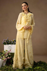 Your go-to for breezy brunches and good vibes. Some day’s call for lightness with lift and the Butteria ensemble delivers both. In a mellow butter yellow, the flowing top features long ruffled sleeves cinched with delicate ties, giving it the feel of an unfussy statement. The fabric holds a gentle sheen, quietly catching the light, while the wide-legged pants sparkle with layered lace flowers and glinting beadwork clustered at the hem. Equal parts fluid and festive, it’s made for spontaneous brunches that might just turn into parties.