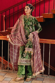 The lush meadow green of Beena evokes verdant film sets where dreams blossomed. This velvet creation features a shirt and trousers adorned with exquisite mughal floral motifs and heavily embroidered borders featuring floral vines and geometric motifs  brought to life by intricate adda work. The sleeves are intricately embellished with shimmering floral boteh cascading across the fabric, adding an ethereal charm. Paired with a lilac-pink dupatta adorned with embroidered chevrons, Beena is a cinematic homage to the timeless grace of Lollywood’s beloved heroine