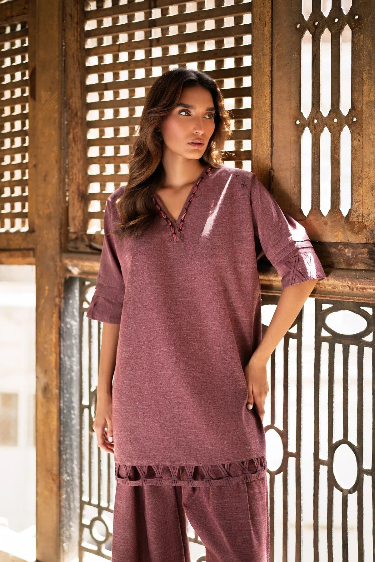 A rich toned co-ord crafted in a textured weave, finished with tonal fabric details along the neckline, hem, and pant cuffs.