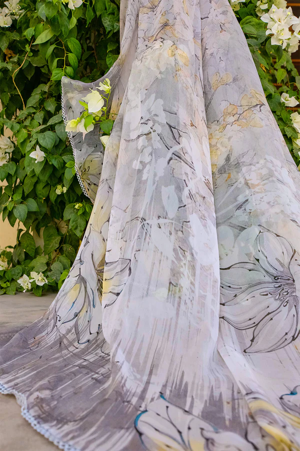 Bright and breezy, this lemon-yellow ensemble is adorned with soft floral prints in muted white and grey tones, creating a fresh and uplifting look. The shirt features relaxed tailoring with flared sleeves, along with white and grey embroidery on the neckline of the shirt that is continuing onto the sleeves. The trousers have a different print in the same muted tones subtly embroidered at the hem. Styled with a sheer printed dupatta in a soft grey gradient, this outfit perfectly blends elegance with summer ease. Ideal for daytime outings and casual gatherings.