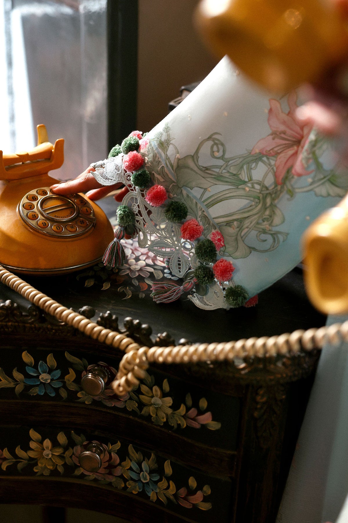 Bathed in the soft glow of early dawn, Khushbu evokes the gentle nostalgia of old Lahore’s blooming gardens. The celestial ice blue canvas cradles delicate cherry blossom and soft pink florals that cascade like petals drifting on a quiet breeze. An embroidered Schiffli neckline, sleeves patti, and hemline border recall the intricate handiwork of bygone artisans, weaving stories of timeless elegance and heritage.