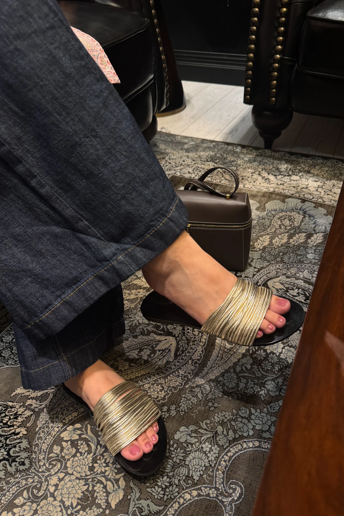 Stylish golden slip-on flats with a wide, multi-layered strap design that adds texture and elegance. The open-toe style offers comfort and versatility, making them a chic choice for both casual outings and festive gatherings. A modern yet timeless addition to any wardrobe.