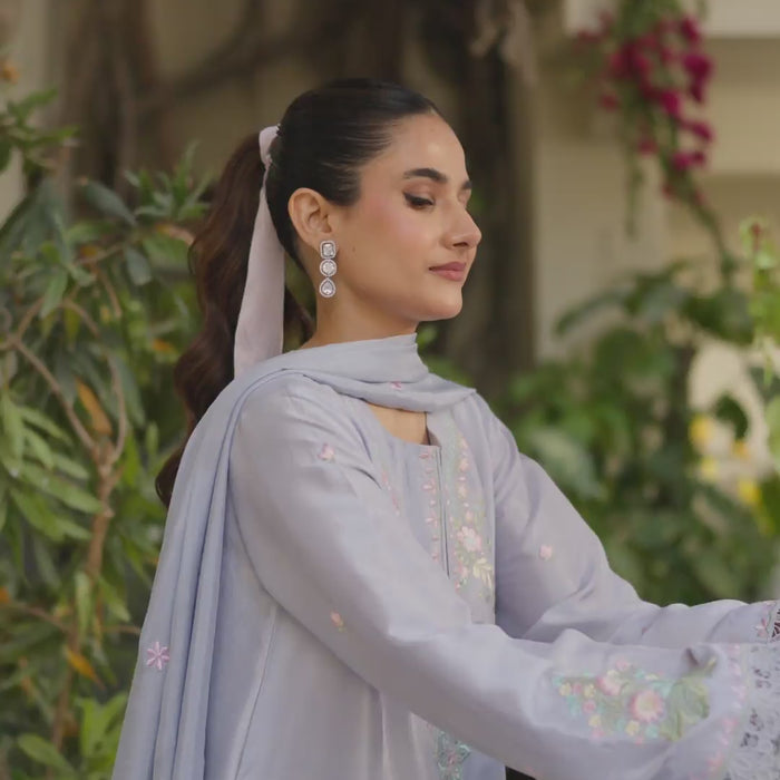 A Refined Periwinkle Short Shirt Paired With a Classic Shalwar, Accentuated With Delicate Pastel Resham Embroidery. The Ensemble is Completed With a Luxurious Silk Dupatta, Elegantly Embroidered to Elevate the Look.