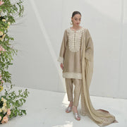 The ensemble is paired with a beige gold shisha organza dupatta with four sided heavy aari work dupatta decorated with shimmering swarovskis and kamdani details